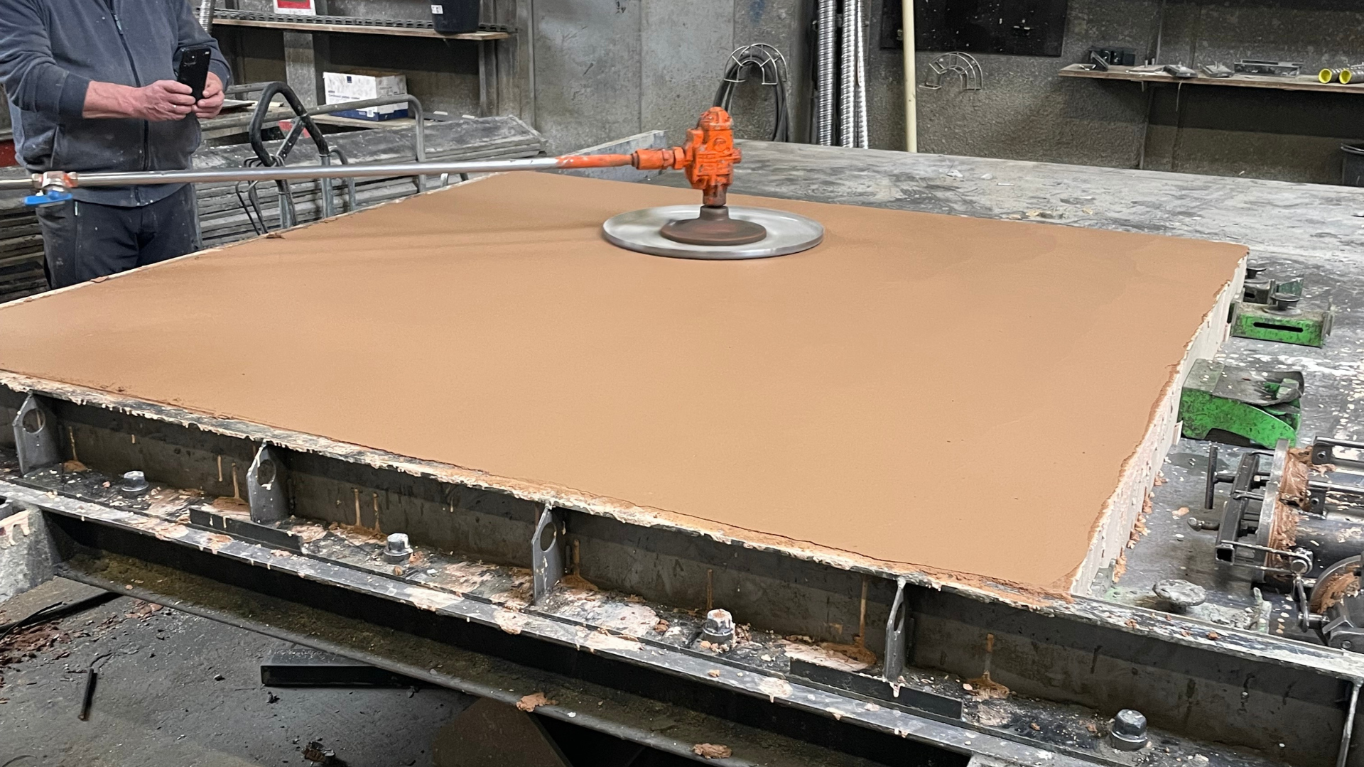 "Det er virkelig et godt resultat, at vi på sigt sandsynligvis kan reducere cementindholdet med 55%", fortæller makkerparret Carsten Sørensen Kronborg, produktionschef, og Jan Roersen, betonspecialist, fra DS Elcobyg. Makkerparret har arbejdet tæt sammen gennem foråret 2025 for at teste moler som alternativ til cement i fuld skala. De er stolte af resultatet, som har givet en pæn overflade, og som ikke revner.