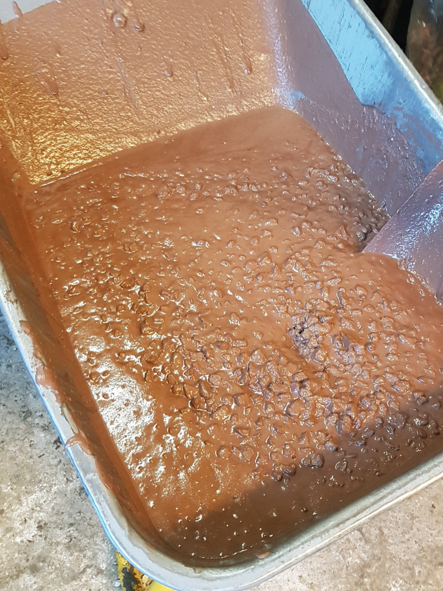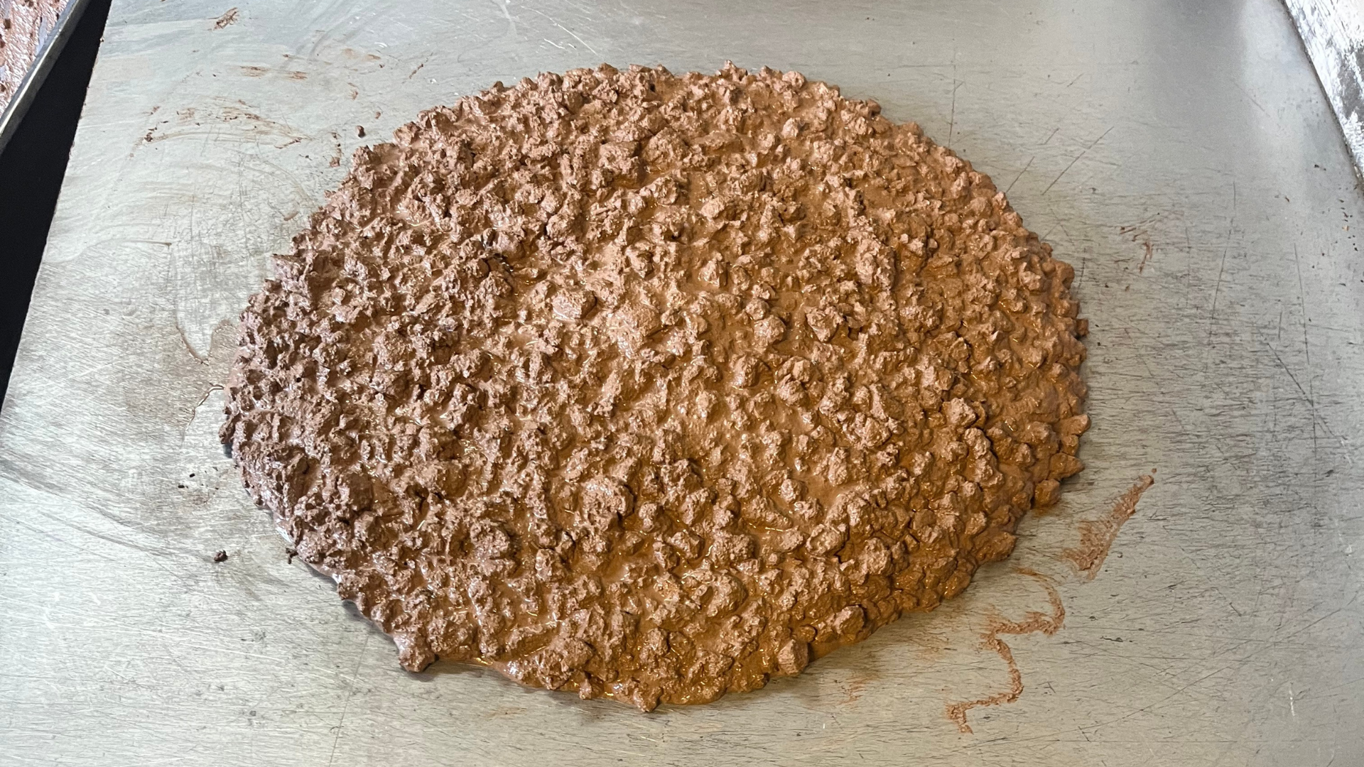 Friskblandet beton med moler som bindemiddel. Den karakteristiske rødlige farve stammer fra moleren og illustrerer materialets unikke visuelle udtryk og struktur.