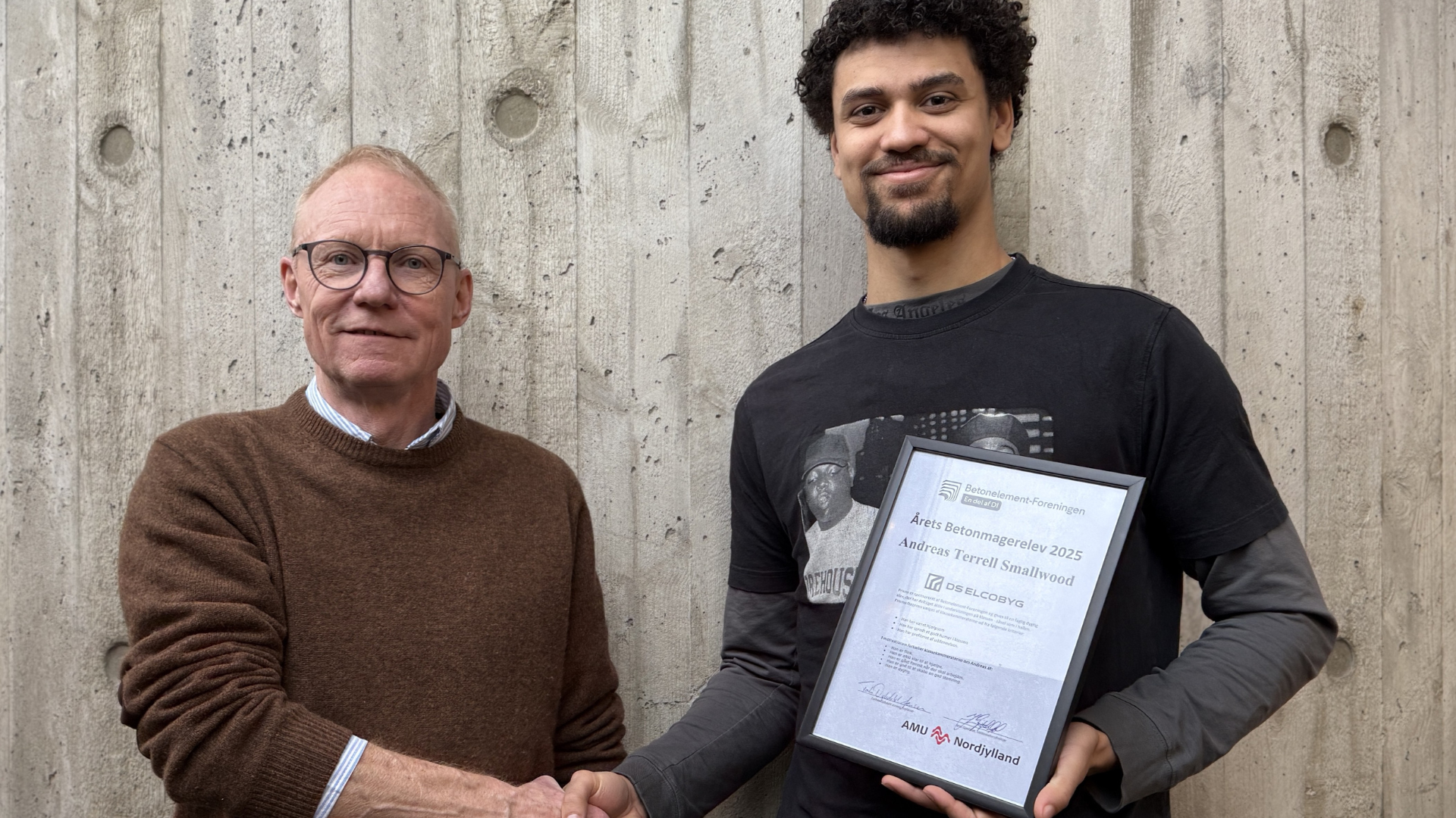 Faglærer Torben Dybdahl Jensen, AMU Nordjylland gratulerer årets betonmagerelev Andreas Terrell Smallwood, DS Elcobyg A/S. Om Andreas fortæller hans klassekammerater, at han er flink, altid klar til at hjælpe, er gået forrest når der skal arbejdes, er god til at skabe en god stemning og er dygtig.