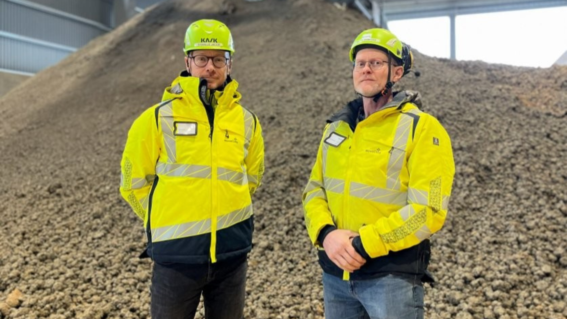 Michael Kyhn Rasmussen (tv.) og Jacob Bisballe (th.) foran den kalcineret ler hos NovaClay