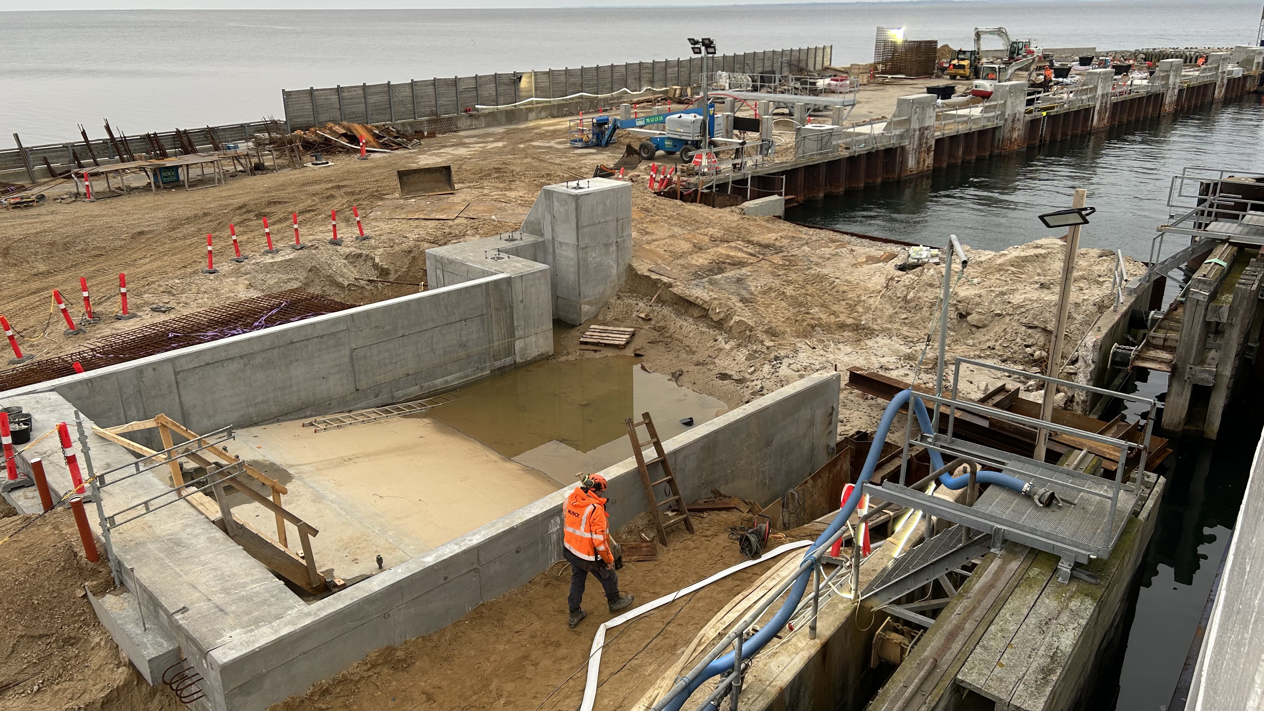 Det er blot nogle af de udfordringer, som virksomheden Munck Havne & Anlæg a/s på det seneste har håndteret i forbindelse med støbningen af fire nye færgelejer på overfarterne Alslinjen og Samsølinjen. Årsagen er, at Molslinjen, der driver de to ruter, har investeret i to nye eldrevne færger, der i løbet af 2025 skal sættes i drift. Både færgernes fysik og deres drivmiddel, altså el, har gjort det nødvendigt med opbygningen af fire nye færgelejer.