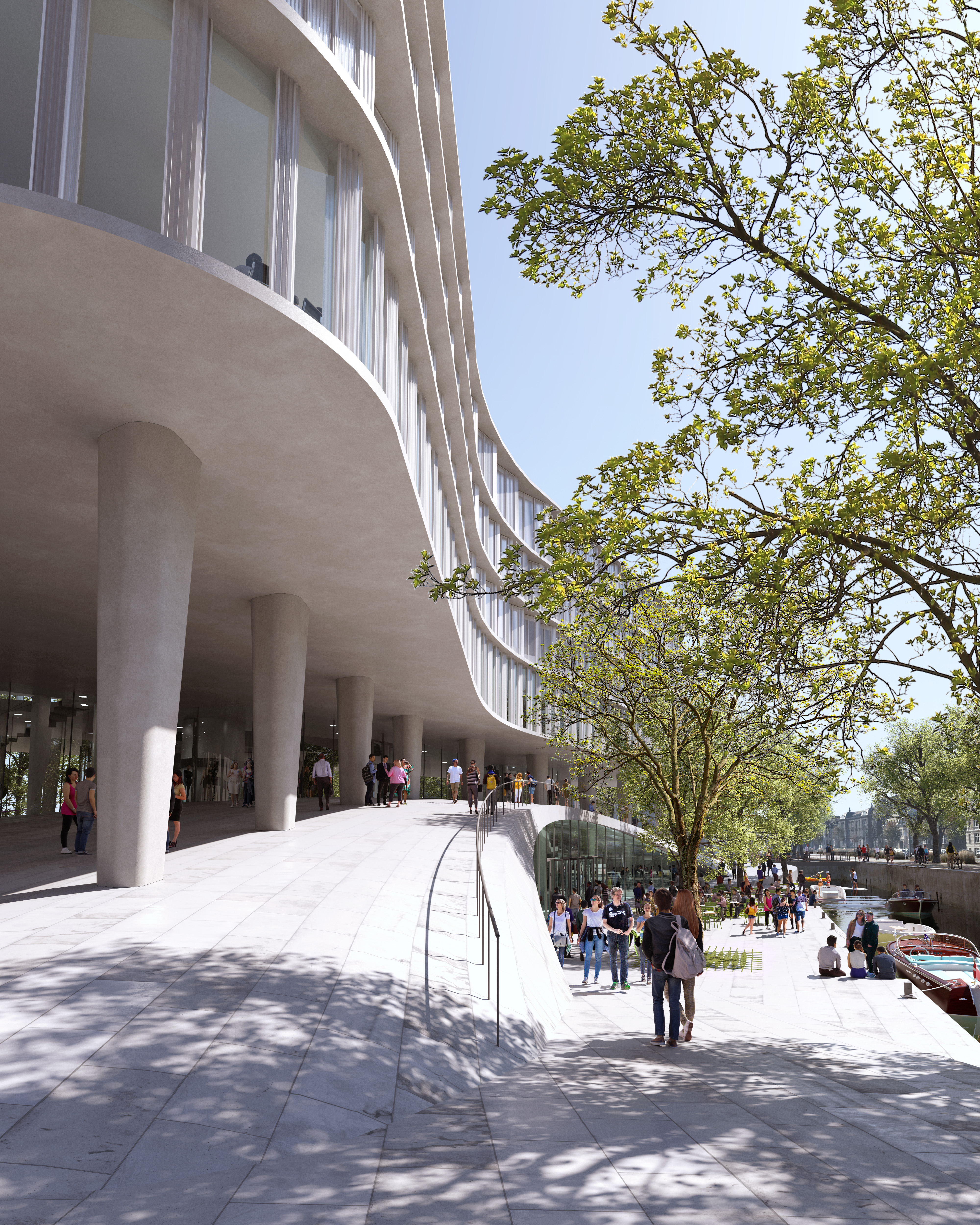 I denne visualisering ser man virkelig, hvorledes det dobbeltkrumme Bakkedæk, der er tænkt som et promenadedæk for offentligheden, kommer til at tage sig ud. Under dette ses indgangen til Markedspladsen. Oven på søjlerne hviler selve den spændende 5-etagers bygning, der er tegnet af arkitekt Dorthe Mandrup.