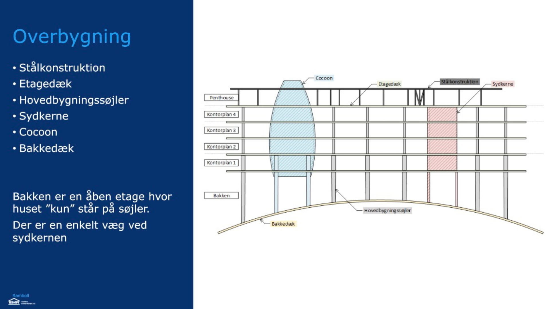 ”Det gør den selvfølgelig ikke, men fra Bakkedækket og op til første etageadskillelse er der cirka seks meter, hvor den hviler på fire søjler. Derfra går den op gennem de fire kontoretager for at slutte på det øverste Penthousedæk,” forklarer Brian Gleerup, der er entrepriseleder i entreprenørvirksomheden EMR Murer & Entreprenør, som står for al støbearbejdet på Hængslet. Forskallingsarbejde samt støbning af Bakkedæk og Cocoon er en stor præstation, for håndværkerne har skullet lære at arbejde med både nye forme og nye metoder.
