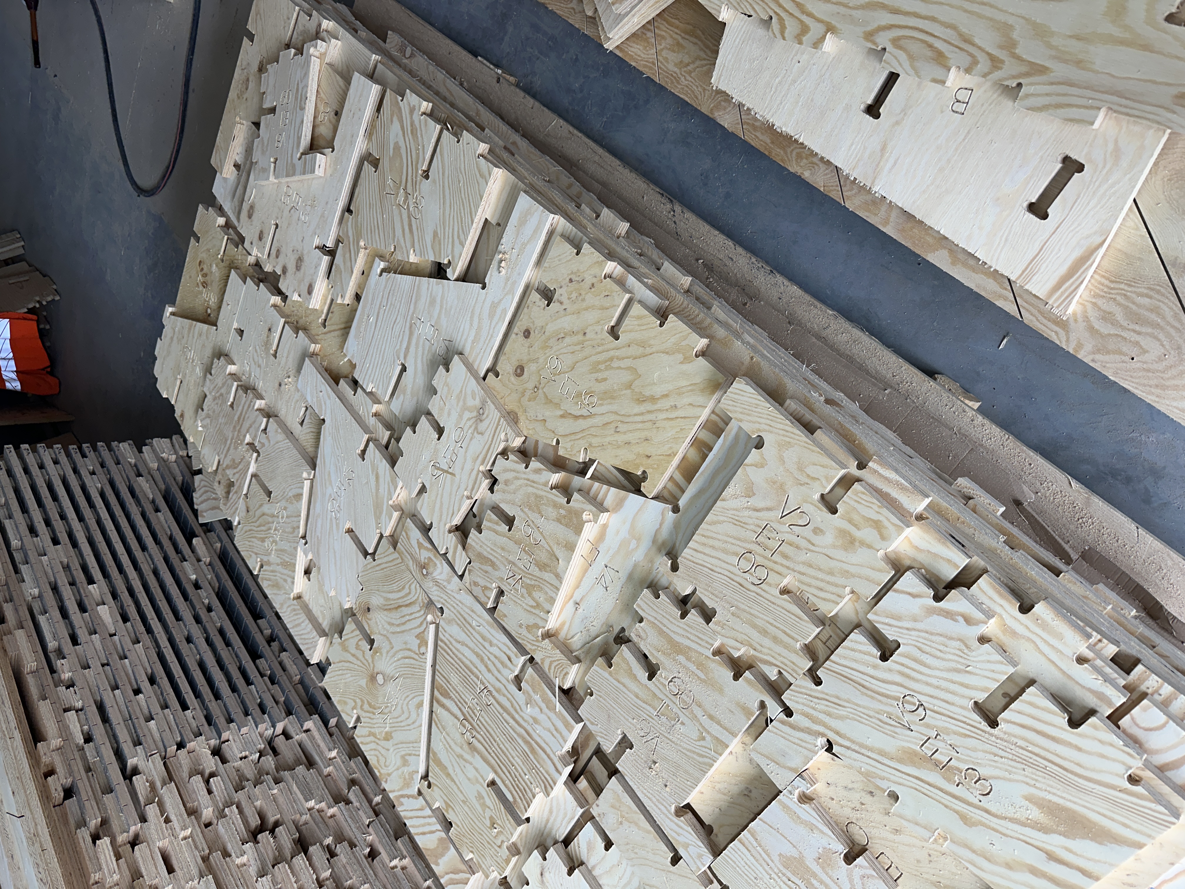 ”Bakkedækket er som nævnt dobbeltkrumt og består af ikke mindre end 1.453 specialdesignede støbekasser hver på 1,25 meter x 1,25 meter, som hver især hviler på et stillads med tilsvarende 1.453 tårne. Disse kasser har vi leveret som CNC-fræsede komponenter, der samles direkte ude på byggepladsen. De leveres som flatpacks, helt lige som når du er en tur IKEA,” forklarer Rene Østergaard.