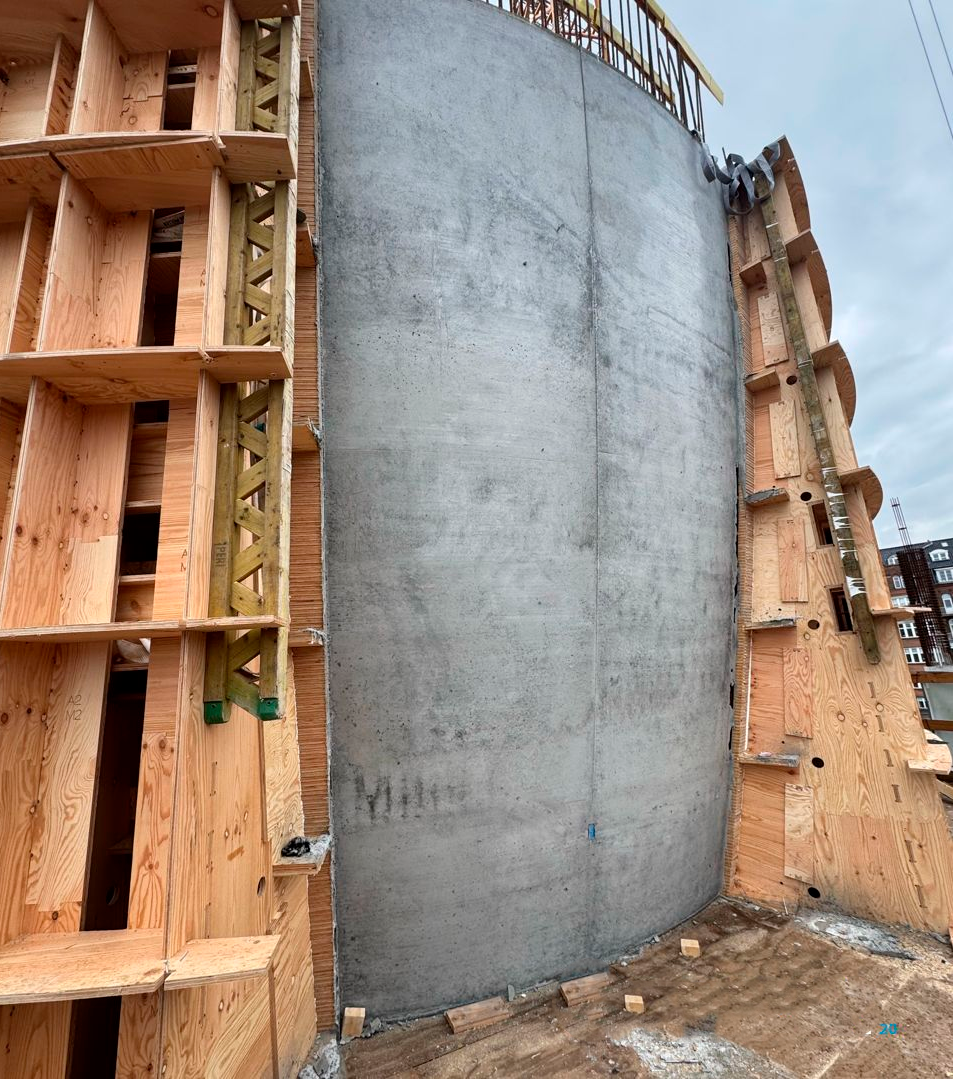 ”At arbejde med både krumme og dobbeltkrumme forme har vi prøvet før, blandt andet i forbindelse med betondomen ved Aros i Aarhus, så det kan vi. Udfordringen kommer lige præcis der, hvor vi møder grænsen for, hvor meget, vi kan bukke en form i krydsfiner. Her træder fræsningen ind som det eneste mulige alternativ, og samarbejdet er altså gået op i en højere enhed. Man kan næsten sige, at mennesker mødes, og smuk beton opstår,” siger Rene Østergaard.