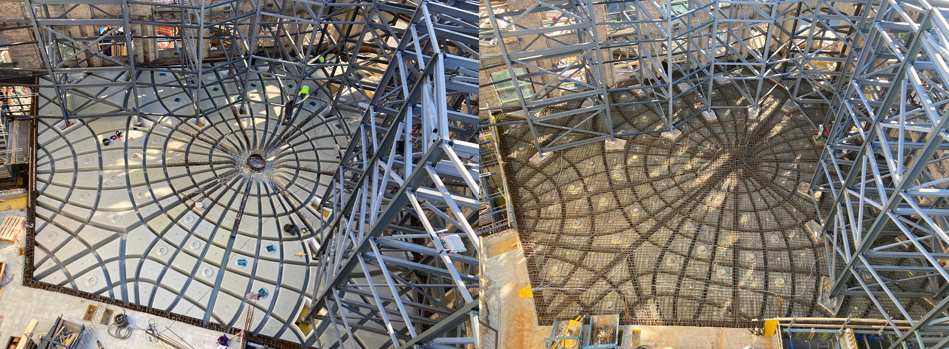 Til venstre ses de mere end 350 polystyrenforme, der udgør skabelonen til det samlede ribbedæk. Til højre ses dækket med den håndbukkede armering udlagt. Med henblik på at sikre en støbning, hvor der efterfølgende ikke kan ses nogen spor af armeringen i de tynde ribber, er den ikke monteret ved hjælp af afstandsskiver, men hængt op i et overliggende armeringsnet.