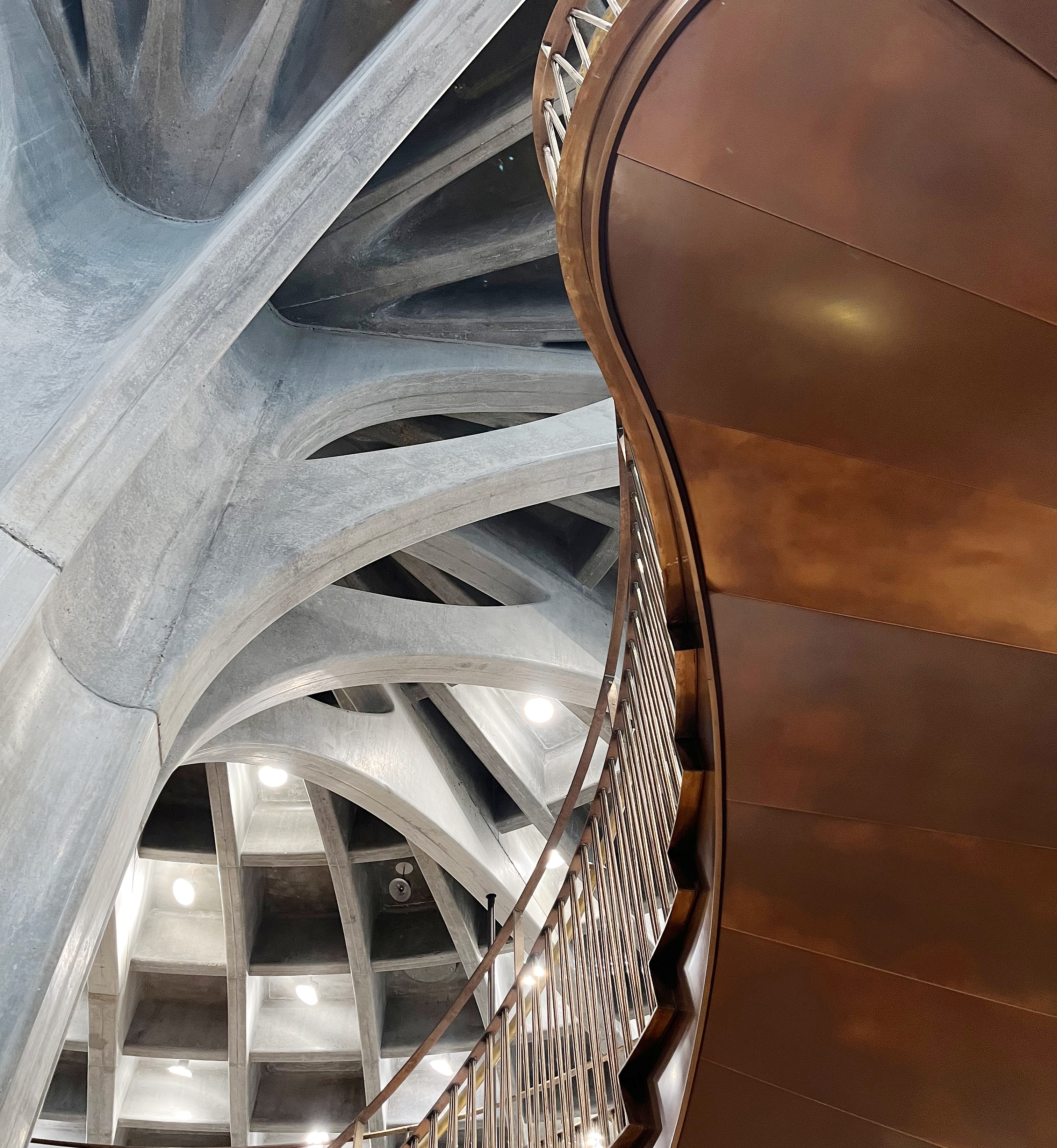 Et kig fra stueetagen op til toppen af søjlen og det ribbebårede in-situ-dæk, der udmærker sig ved fornemme skulpturelle kvaliteter. Konstruktionen bærer tillige et svævende dæk mellem butikkens stueetage og ribbedækket.