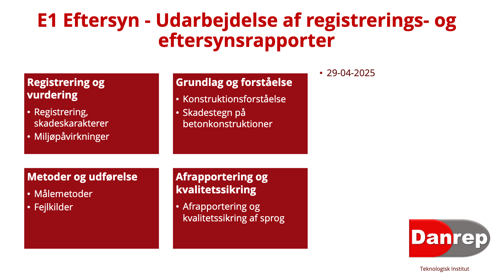 Her ses indholdet i det nye kursus E1, der lanceres allerede til april. Som det ses vil der blandt andet blive fokuseret på konstruktionsforståelse og skadestegn på betonkonstruktioner.