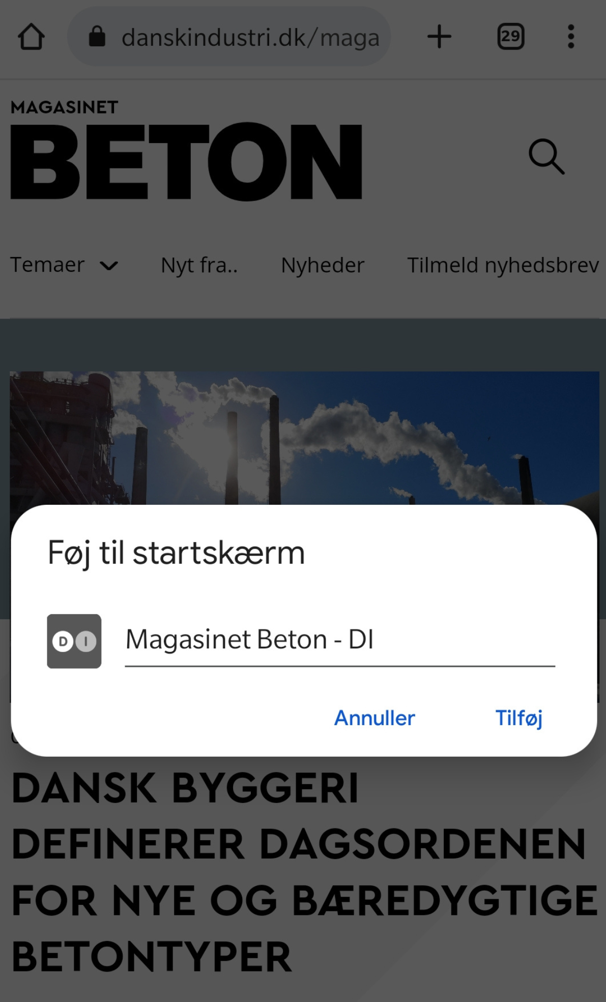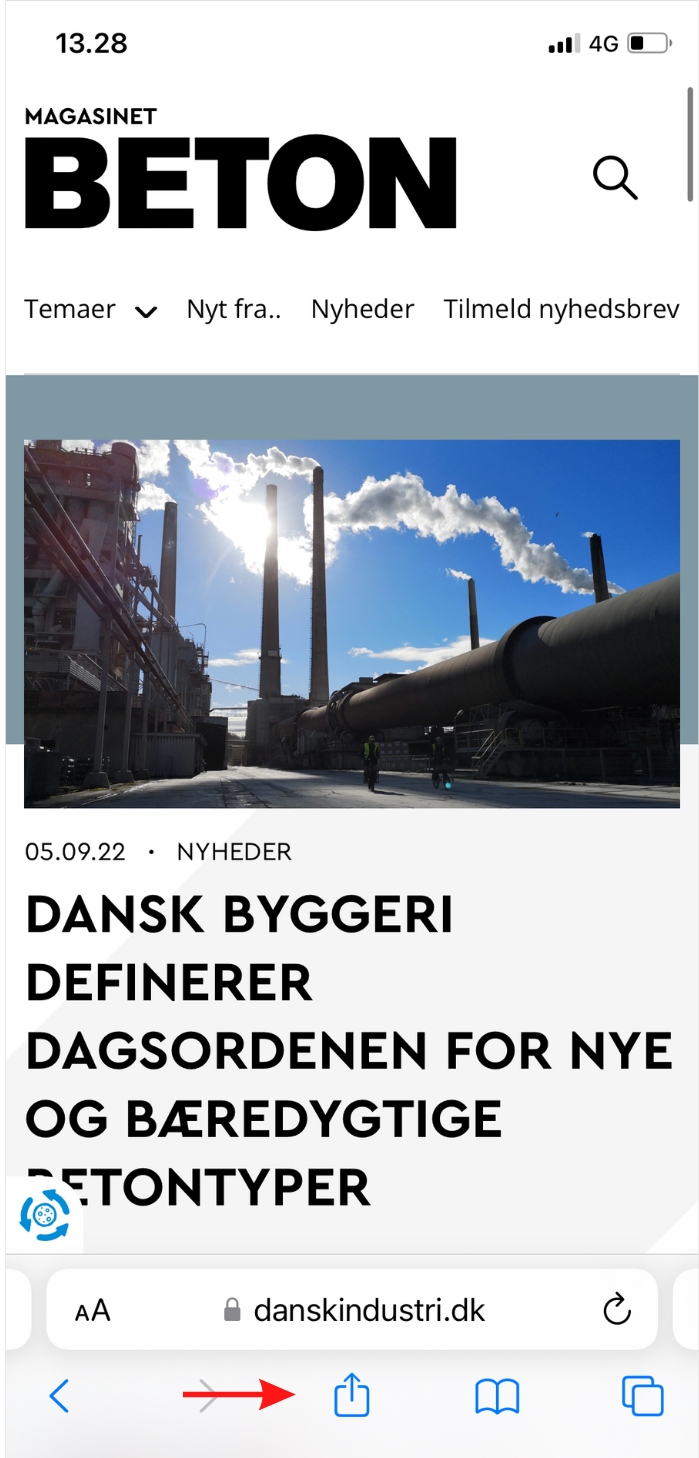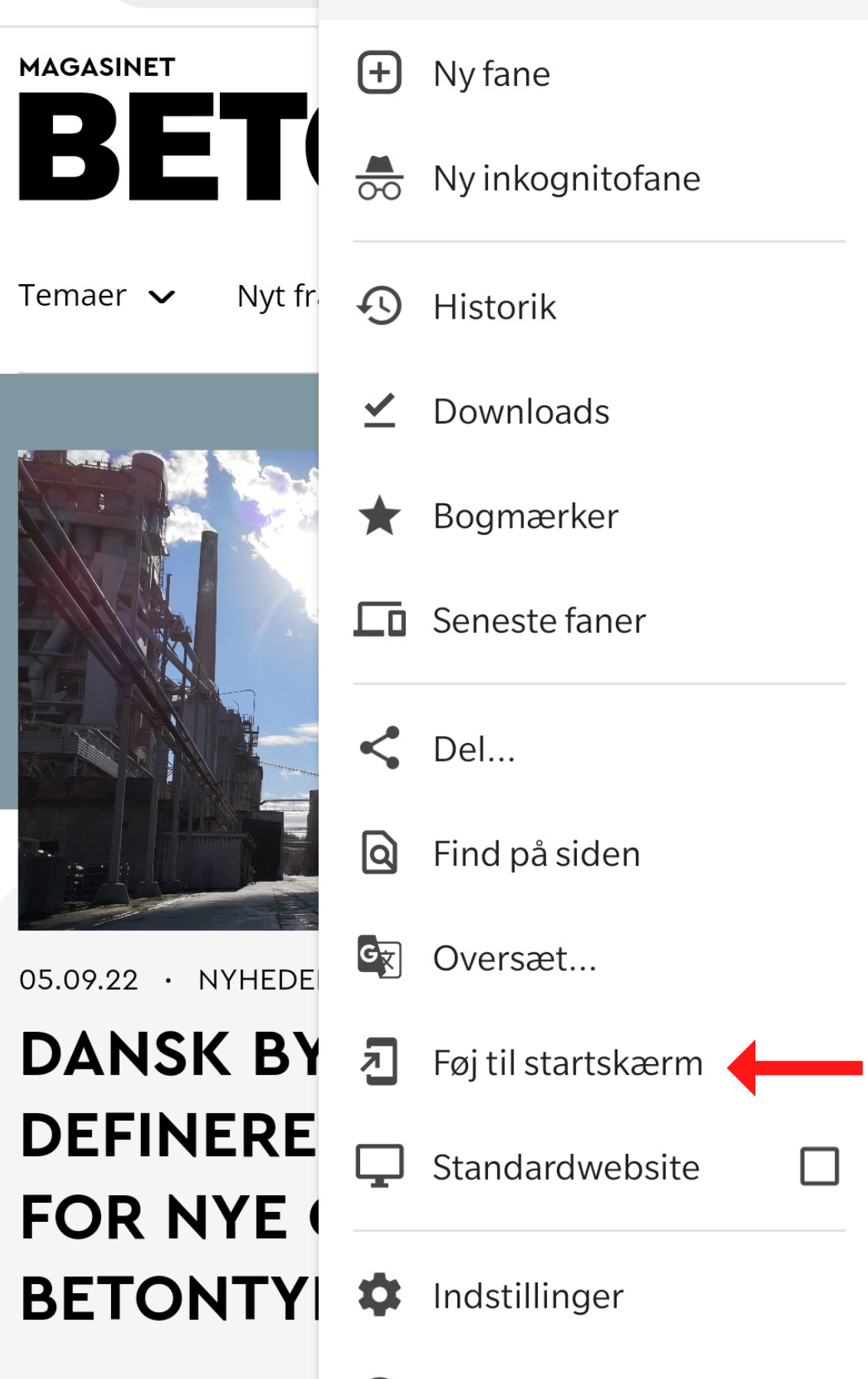 Vidste du, at du kan lave en genvej på din telefons hjemmeskærm, så du kan tilgå Magasinet BETON ligesom en app? Så er du aldrig mere end et klik væk fra inspirerende artikler om byggeri, beton og arkitektur. Her er en guide til, hvordan du gør – uanset om du bruger iPhone eller Android.